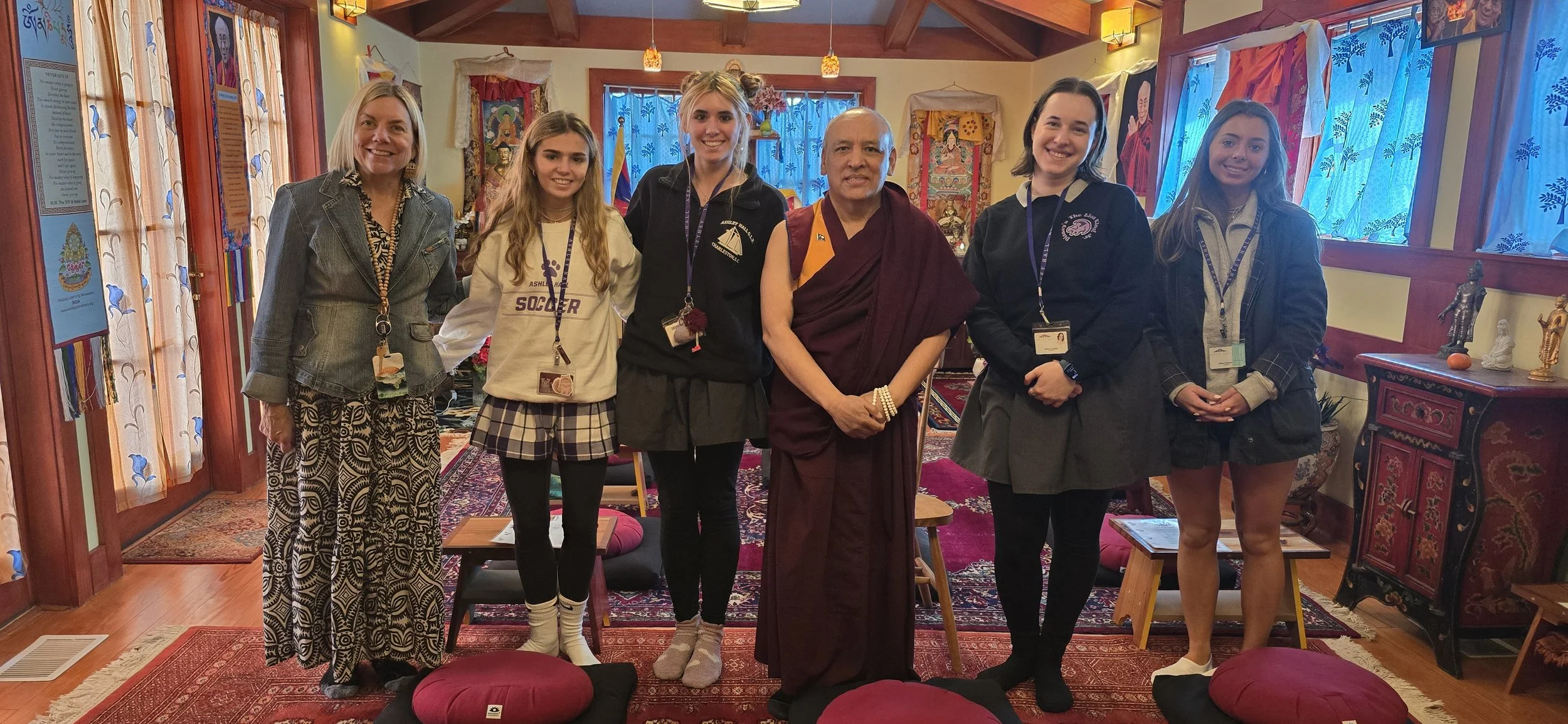 February 10, 2026: The CTS & Geshe-la hosted several seniors from Ashley Hall, as well as their teacher, Chris Hughes (far left). Rylee Keevil (left of Geshe-la) is enrolled in a year long senior project allowing her to explore a topic she’s passionate about, and her guiding question has been: How do we find meaning in life, and how does that meaning benefit our overall well-being? Rylee is interested in Buddhist practices that foster self-understanding, mindfulness, and inner peace, particularly the ways meditation can help cultivate awareness, reduce anxiety, and strengthen the connection between mind and body.